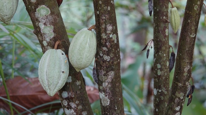 October 26, 2017. Cocoa Trees are native to Central and South America. This species is now grown throughout the tropical world. This species is assumed to be native in southeastern Mexico but probably not in Jalisco. The cocoa beans, found inside the pods, which grow from the stems and trunk of the plant, are ground to produce chocolate, in its various forms. The beans found in about twenty of the pods shown above is required to produce a pound of cocoa paste.